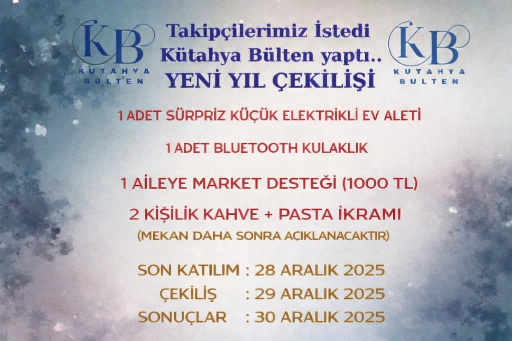 Çekiliş Hediyeleri Sürpriz küçük elektrikli ev aleti Bluetooth kulaklık 1000 TL market desteği 2 kişilik kahve ve pasta ikramı (mekan daha sonra açıklanacaktır) Katılım Şartları Çekilişe katılmak isteyenlerin; Kütahya Bülten Instagram sayfasını takip etmesi, Kütahya Bülten Facebook profili ile arkadaş olması, Gönderiyi beğenmesi, Yorumlarda 3 arkadaşını etiketlemesi, Kütahya Bülten YouTube kanalına abone olması, Gönderiyi hikâyesinde paylaşması, www.kutahyabulten.com’u ziyaret etmesi gerekiyor. Yetkililer, çekilişin Instagram yorumları üzerinden yapılacağını, Facebook ve YouTube şartlarının ise kazananlardan belge ile kontrol edileceğini bildirdi. Kazanan Instagram hesabının sahibinin, Facebook ve YouTube şartlarını bizzat kendisinin sağlaması gerektiği ifade edildi. Tarihler ???? Son Katılım: 28 Aralık 2025 ???? Çekiliş: 29 Aralık 2025 ???? Sonuçların Açıklanması: 30 Aralık 2025