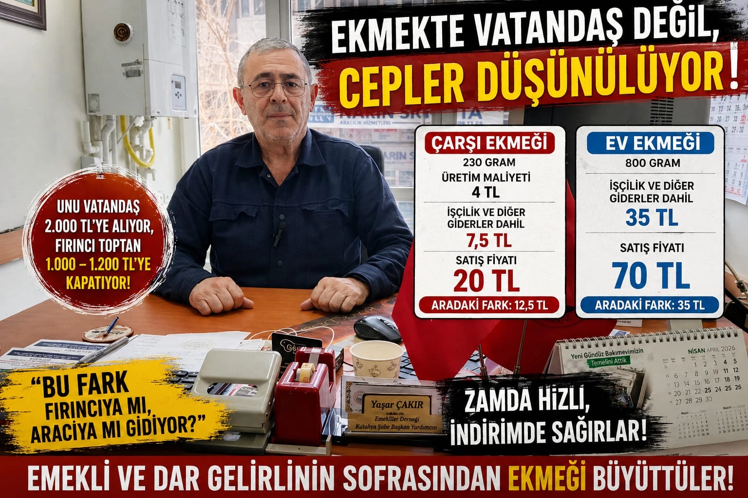 Kütahya’da ekmek fiyatlarıyla ilgili dikkat çeken bir iddia gündeme geldi. Emekliler Derneği Kütahya Şube Başkan Yardımcısı Yaşar Çakır, fırıncılık sektöründeki maliyet ve satış fiyatları arasındaki farkı rakamlarla ortaya koyarak sert açıklamalarda bulundu. Çakır’ın paylaştığı veriler, özellikle dar gelirli vatandaşlar ve emekliler açısından tartışmayı büyütecek nitelikte. Çarşı Ekmeğinde Büyük Fark: 7,5 TL’ye Mal, 20 TL’ye Satış Yaşar Çakır’ın açıklamasına göre 230 gramlık çarşı ekmeğinin üretim maliyeti yaklaşık 4 TL. İşçilik ve diğer giderler eklendiğinde bu rakam 7,5 TL’ye kadar çıkıyor. Ancak aynı ekmek tezgâhlarda 20 TL’den satışa sunuluyor. Çakır, aradaki 12,5 TL’lik farkın kimlerin cebine gittiğini sorgulayarak, “Bu fark fırıncıya mı, aracıya mı gidiyor? Neden faturayı sürekli emekli ve dar gelirli ödüyor?” ifadelerini kullandı.