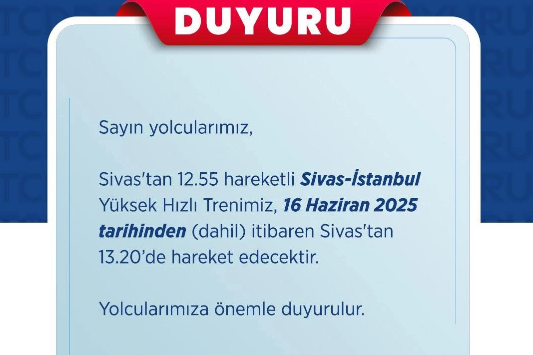 Sivas'tan 12.55 hareketli Sivas-İstanbul Yüksek Hızlı Trenimiz, 16 Haziran 2025 tarihinden (dahil) itibaren Sivas'tan 13.20’de hareket edecektir.