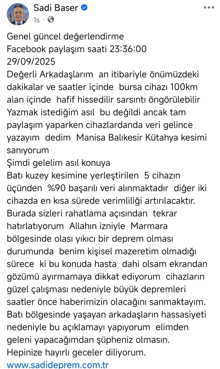 Deprem Uzmanı Sadi Başer, Kütahya ve çevresinde kurulan deprem izleme cihazlarından alınan son verilere ilişkin önemli açıklamalarda bulundu. Başer, önümüzdeki saatlerde Bursa merkezli 100 kilometrelik alanda hafif hissedilebilir sarsıntıların yaşanabileceğini belirtti.