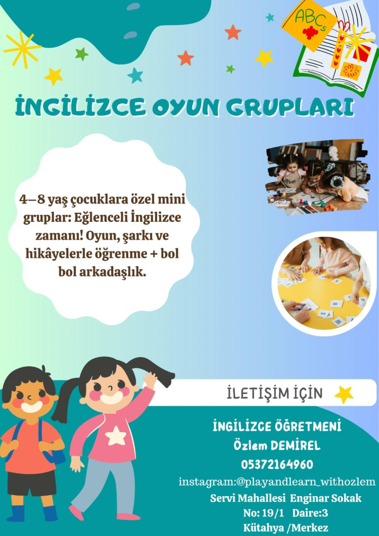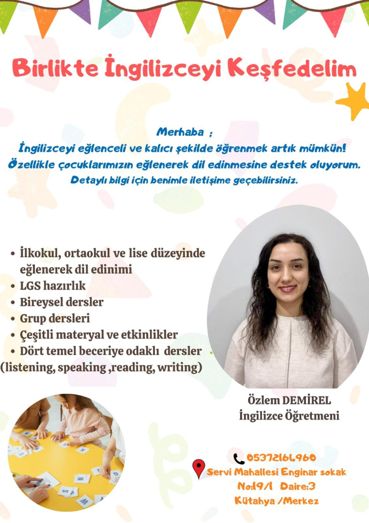 Kütahya'da öğretmen Özlem Demirel, eğlenceli derslerle İngilizce öğrenimini eğlenceli hale getiriyor. 4-8 yaş çocuklar için oyun, şarkı ve hikâyelerle dil eğitimi veriliyor. Eğitimler Kütahya Merkez'de gerçekleştiriliyor ve kayıtlar devam ediyor.