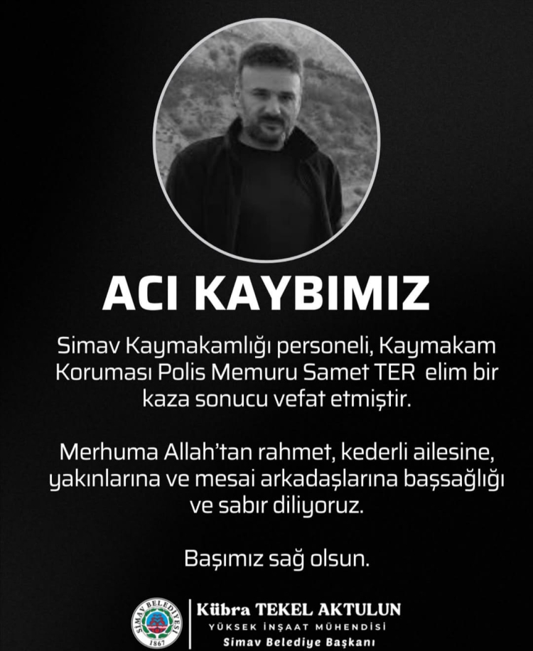 Kütahya'da motosikletle karavan çarpışması sonucu Simav Kaymakamı'nın koruma polisi Samet Ter yaşamını yitirdi. 36 yaşındaki Ter, Gediz–Altıntaş yolunda ters yönden gelen karavanla çarpıştı, ağır yaralı olarak kaldırıldığı hastanede hayatını kaybetti.