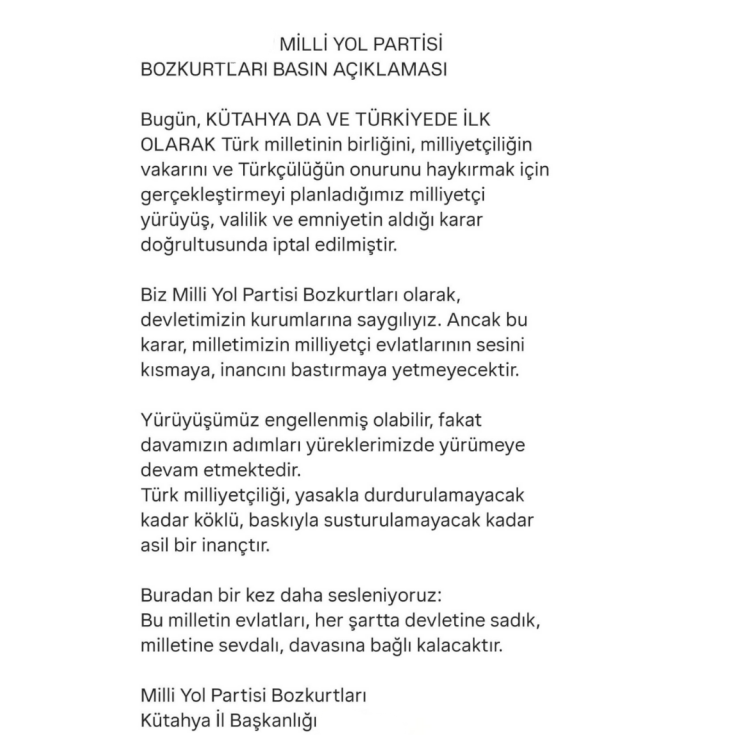 Yürüyüşün organizatörü Milli Yol Partisi Bozkurtları, iptal kararının ardından sosyal medya üzerinden bir açıklama yaparak, “Yürüyüşümüz engellenmiş olabilir fakat davamızın adımları yüreklerimizde yürümeye devam etmektedir” ifadelerini kullandı.