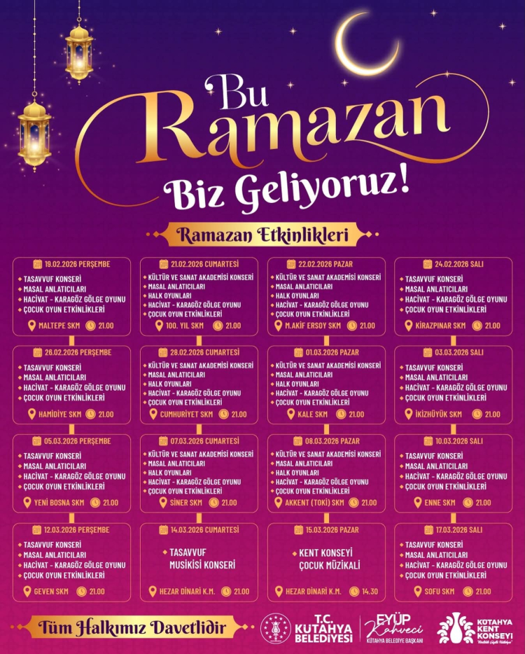 Kütahya Belediyesi, 2026 Ramazan ayı kapsamında düzenleyeceği etkinlik takvimini kamuoyuyla paylaştı. “Bu Ramazan Biz Geliyoruz” sloganıyla hazırlanan program kapsamında şehir genelinde farklı mahallelerde kültürel ve manevi içerikli etkinlikler gerçekleştirilecek.