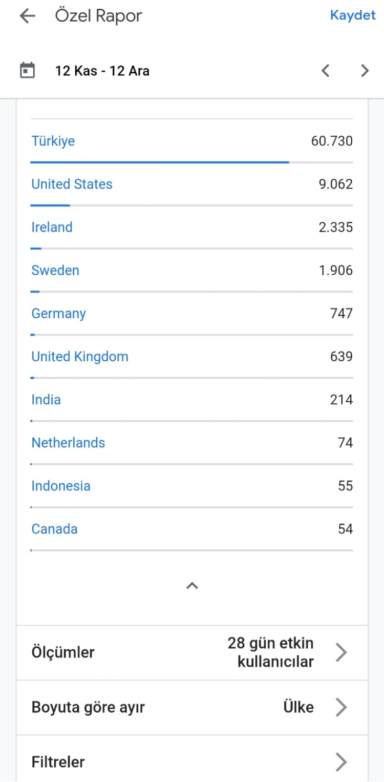 Paylaşılan ülke bazlı istatistiklere göre Kütahya Bülten, son 28 gün içerisinde 10’dan fazla ülkede on binlerce aktif kullanıcıya ulaştı. En yüksek erişim Türkiye’den gerçekleşirken, başta Amerika Birleşik Devletleri ve Avrupa ülkeleri olmak üzere yurt dışı okur trafiğindeki artış dikkat çekti.