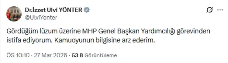 “Gördüğüm lüzum üzerine MHP Genel Başkan Yardımcılığı görevinden istifa ediyorum. Kamuoyunun bilgisine arz ederim.”